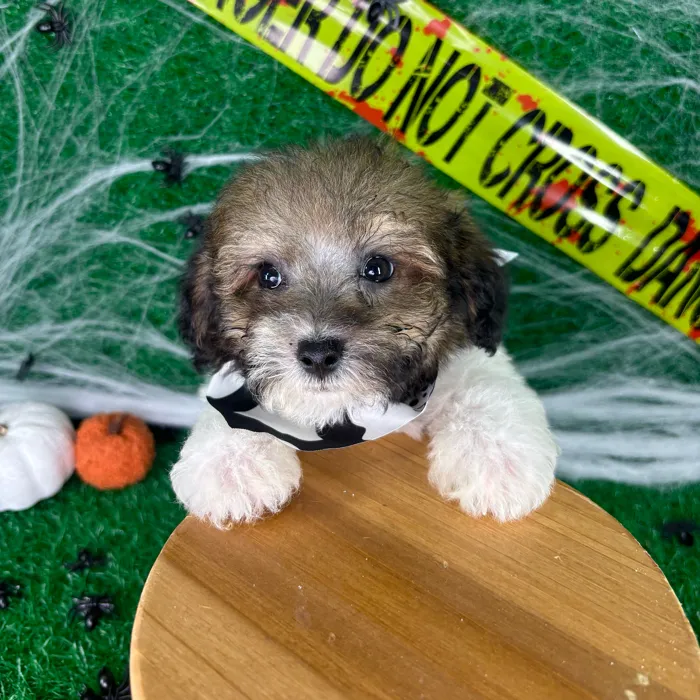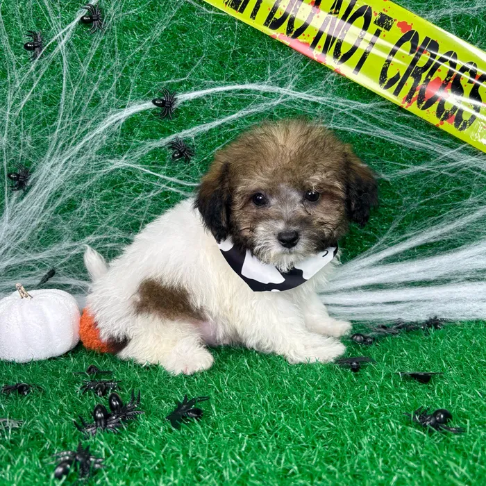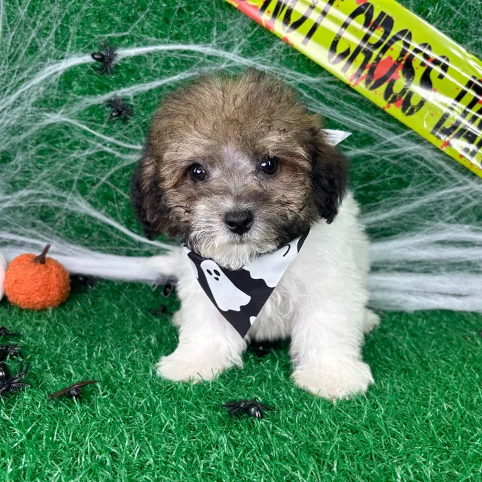 Hello, my name is Hershey! I am a Male, tricolor Bichon-Poodle. I was born on August 18, 2025. I am up to date on all my vaccinations and de-worming. I will go home with a comfortable kennel and all the basic essentials a new puppy needs. I also come with a 3 year hereditary and congenital warranty and a microchip with a lifetime activation for free (in case I ever get lost)! I also come with lifetime basic training classes when you adopt me at your local Puppy Dreams Puppy Store. While we're at it, I also come with grooming services which will keep me clean and fresh so I will always be huggable and kissable. I am in search for my "furever" family, so please come in today at our Puppy Dreams - Garland location! Please call our store in Puppy Dreams - Garland and one of our lovely puppy counselors can answer all of your questions!